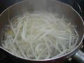 味噌ラーメンやもやしラーメン用にもやしを茹でた。もっとも簡単に、省エネでゆでる方法だ。蓋をして蒸し煮をする。