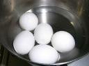 ついでにゆで卵も作った 殻の太い底にキズをつけて 少ない湯で蒸した |