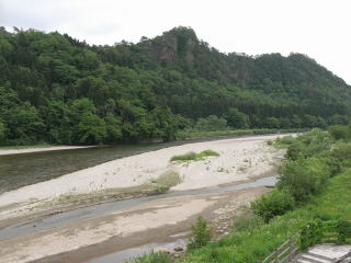 寺院群地区 右は北上川
